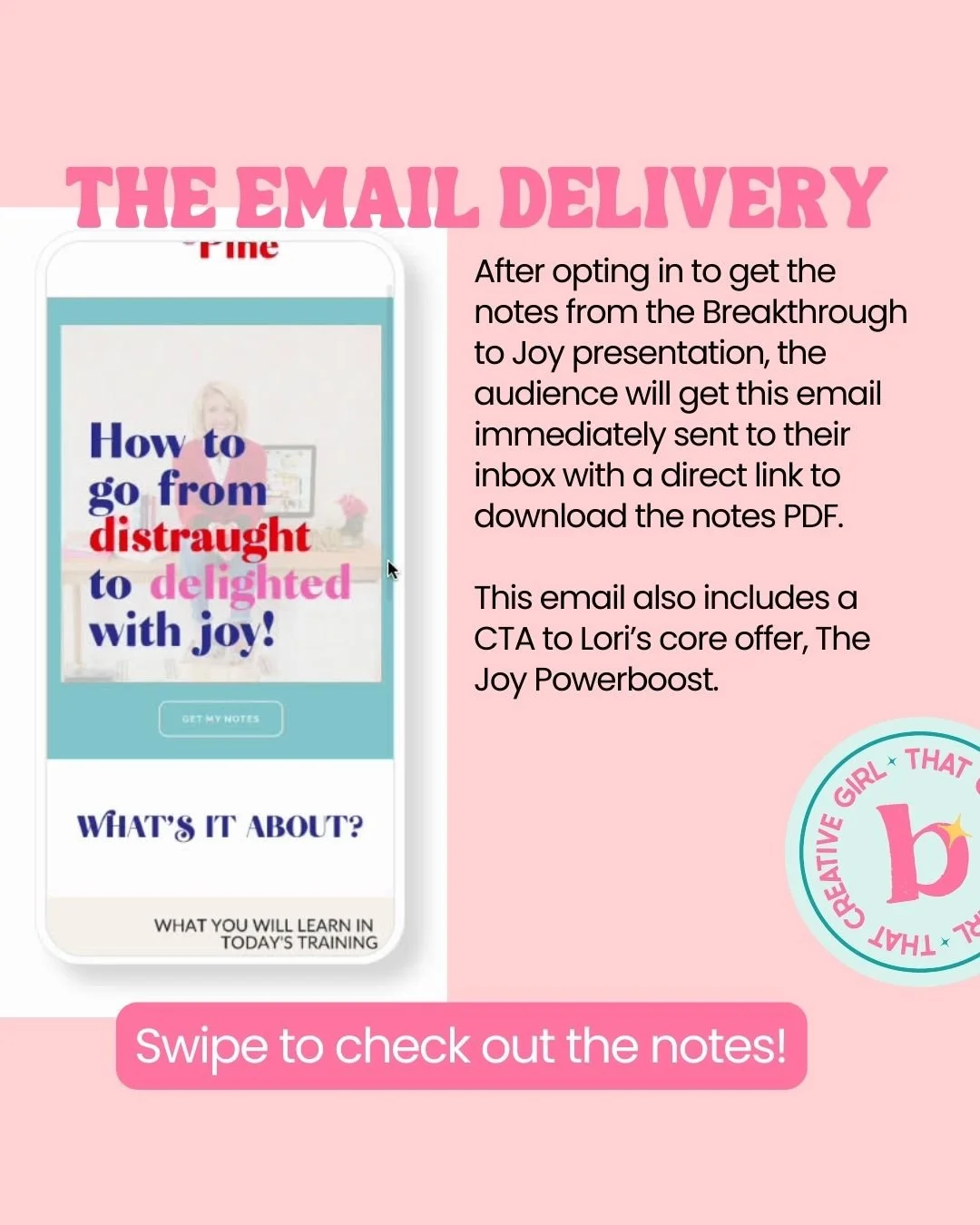 After opting in to get the notes from the presentation, the audience will get an email with a direct like to download the notes as well as a call to action to book a discovery call.